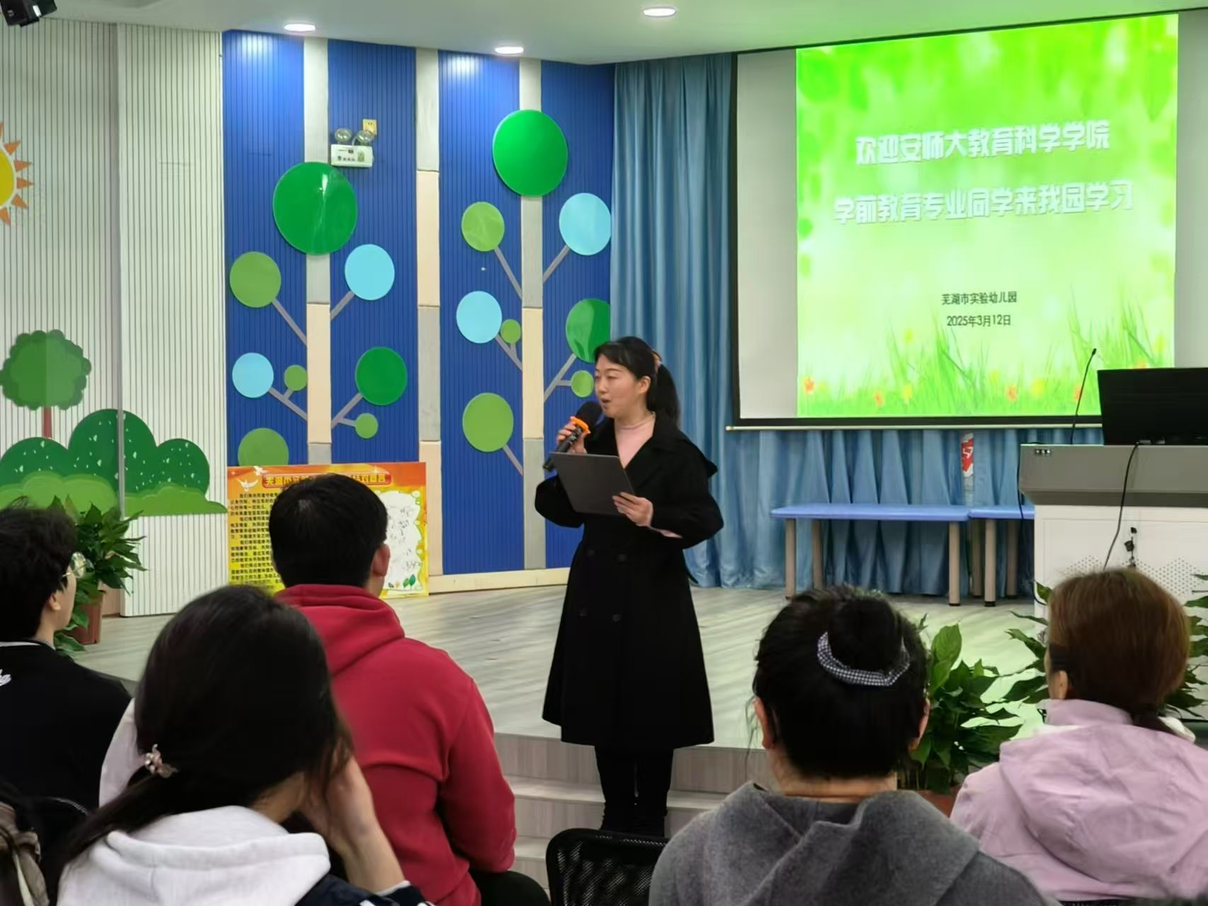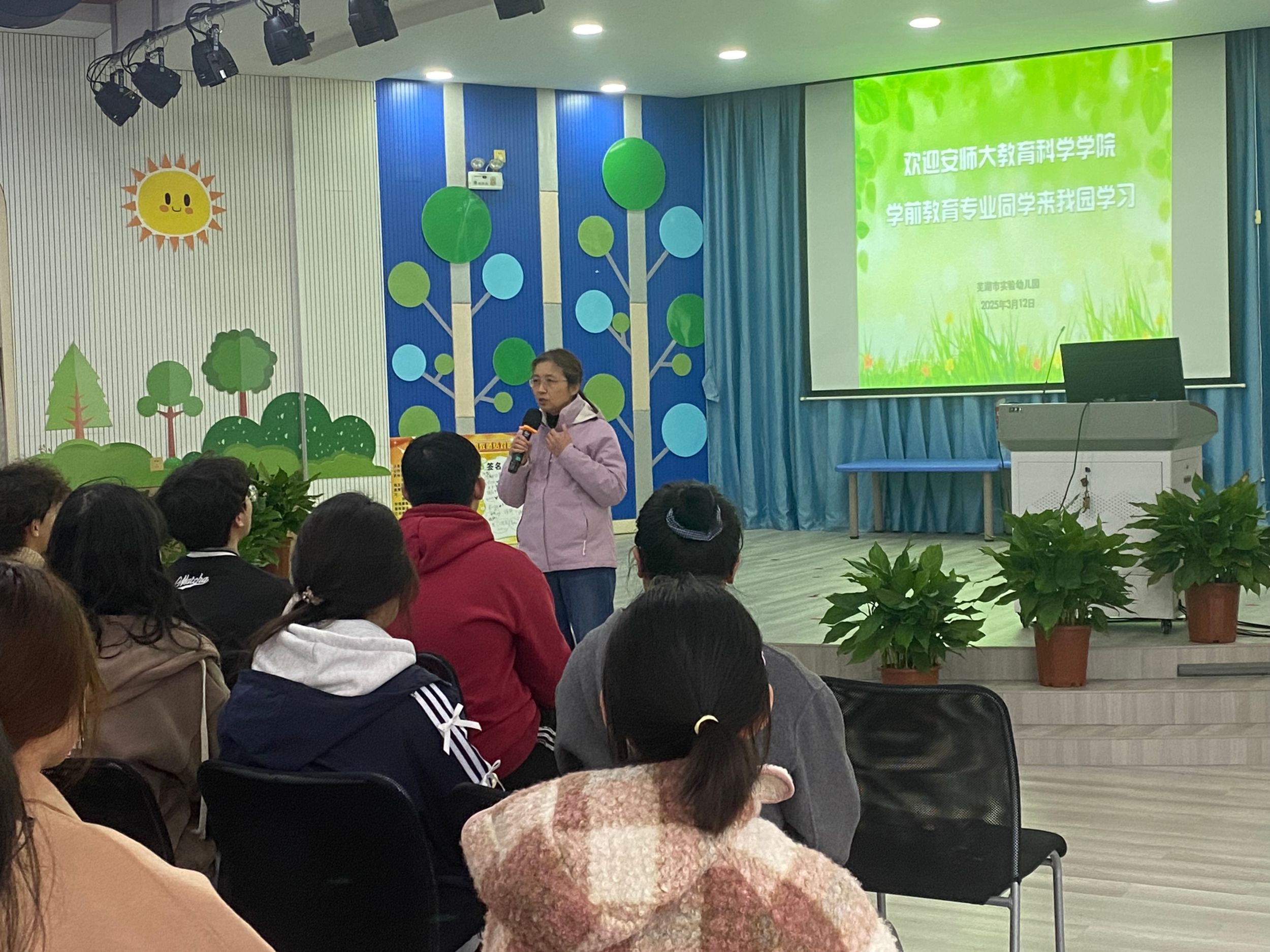 2025年3月12日,2024级学前教育全体同学在吴玲老师的带领下第一次前往芜湖市实验幼儿园。为了确保活动的顺利进行,幼儿园为同学们召开了欢迎会与动员会,实验幼儿园朱小颖老师与吴玲老师分别进行了动员讲话,同时明确了相关纪律与要求,以保证“幼儿个性鉴定活动”的顺利进行。
