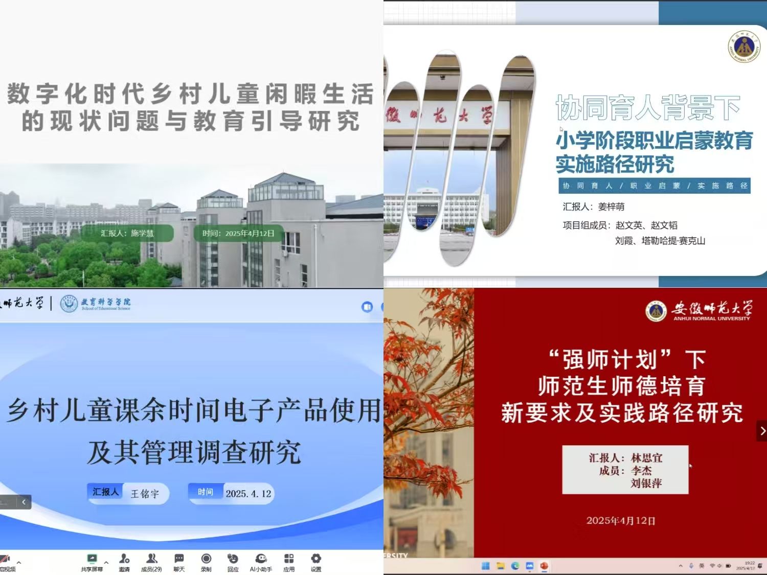 本次答辩会共有4个小组参与,均为国家级项目。项目选题丰富多样,分别为“数字化时代乡村儿童闲暇生活的现状问题与教育引导研究”、“协同育人背景下小学阶段职业启蒙教育实施路径研究”、“乡村儿童课余时间电子产品使用及其管理调查研究”和“强师计划下师范生师德培育新要求及实践路径研究”。现场答辩流程分为PPT汇报、专家提问、学生作答三个环节。各项目负责人从研究内容、研究过程、研究成果等方面进行汇报。