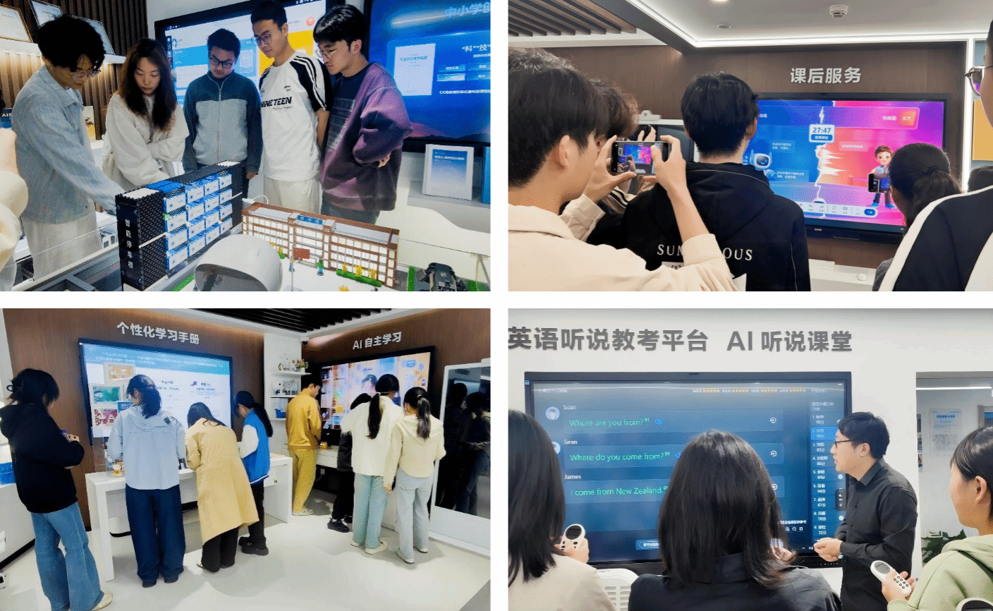 上午十点,师生一行抵达基地,安徽师范大学智能教育研究院副研究员、科大讯飞教育技术研究院高级研究员胡健热情接待并引领参观九楼智慧教育展厅。从精准化数智作业系统到沉浸式AI听说课堂,从五育融合评价体系到便捷的学校数智基座,前沿教育科技成果令师生赞叹。