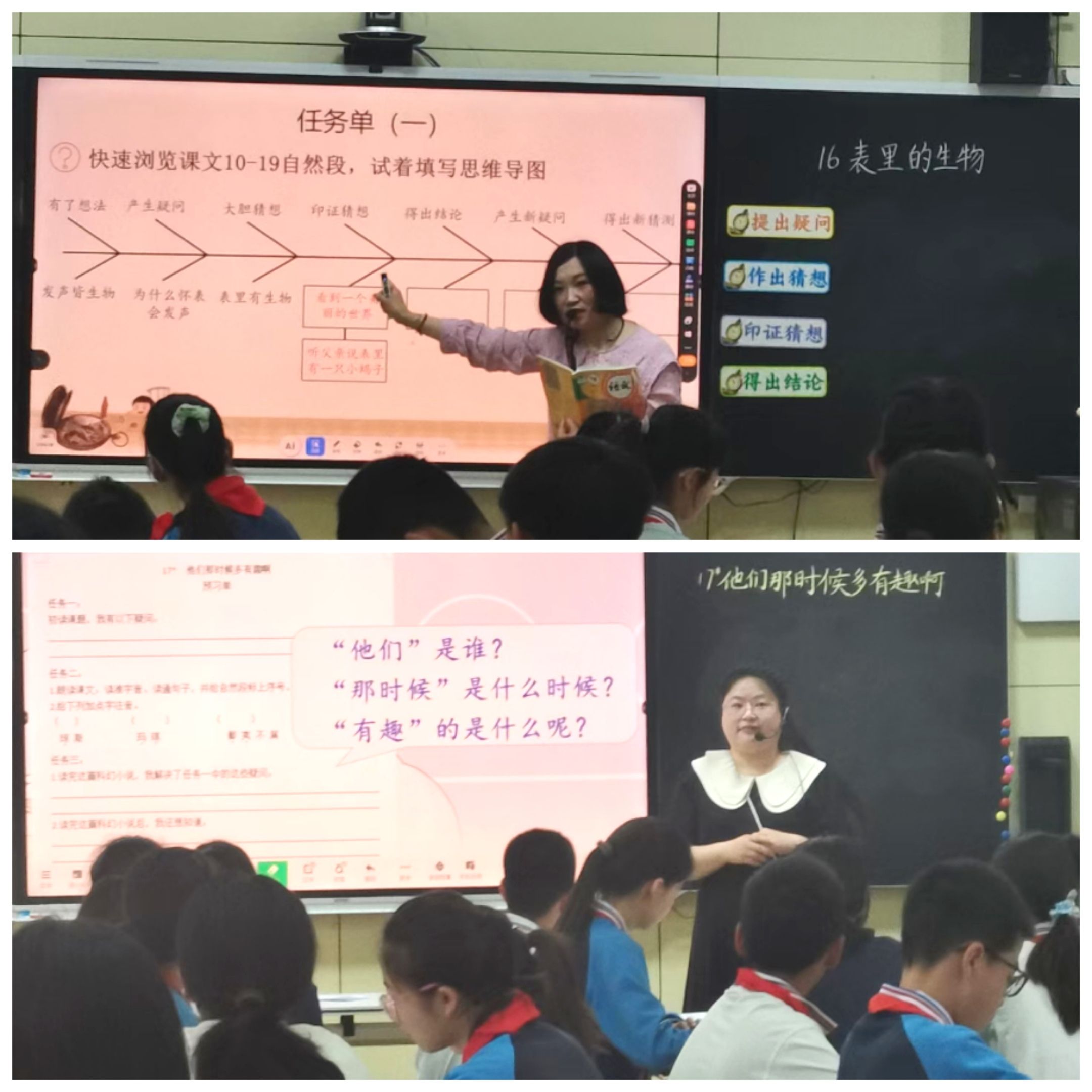 见习期间,同学们深入小学课堂,观摩教学,学习一线教师的教学设计、课堂互动及信息化手段的运用。在何俊老师执教的《表里的生物》语文公开课和王思媛老师执教的《他们那时候多有趣呀》语文课上,授课教师均巧妙运用人工智能技术和多媒体资源呈现AI技术支持下的新型课堂。课上,同学们认真记录AI技术在课堂教学中的应用策略,深刻体会到技术对教学模式的革新。