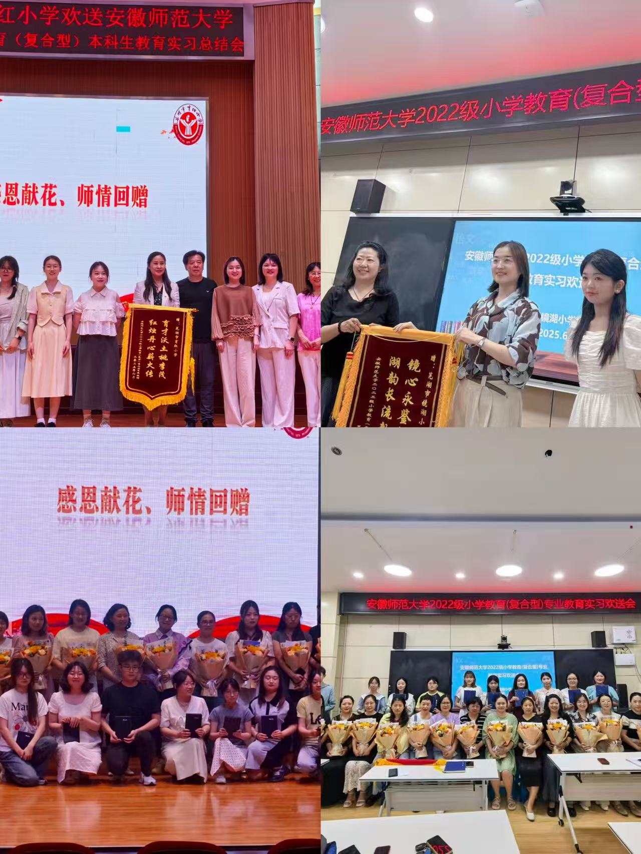 专业负责人陈晨老师、校内指导老师姚运标、胡微老师分别对育红、镜湖小学倾力提供优质实践平台并精心培养表示感谢,并希望双方能够继续深化合作,共同为培养优秀的小学教育人才贡献力量。他们也对实习生三个月以来的辛勤付出给予了充分的肯定和赞赏,希望他们将教育实习中学到的本领在理论和实践领域继续发扬光大,永葆育人初心,在教育道路上不断前行。育红小学校长贾红娟用“以爱育人”“以学促行”“以梦为马”三句箴言作结,肯定实习生的同时,更期待未来能共绘基础教育新图景。
