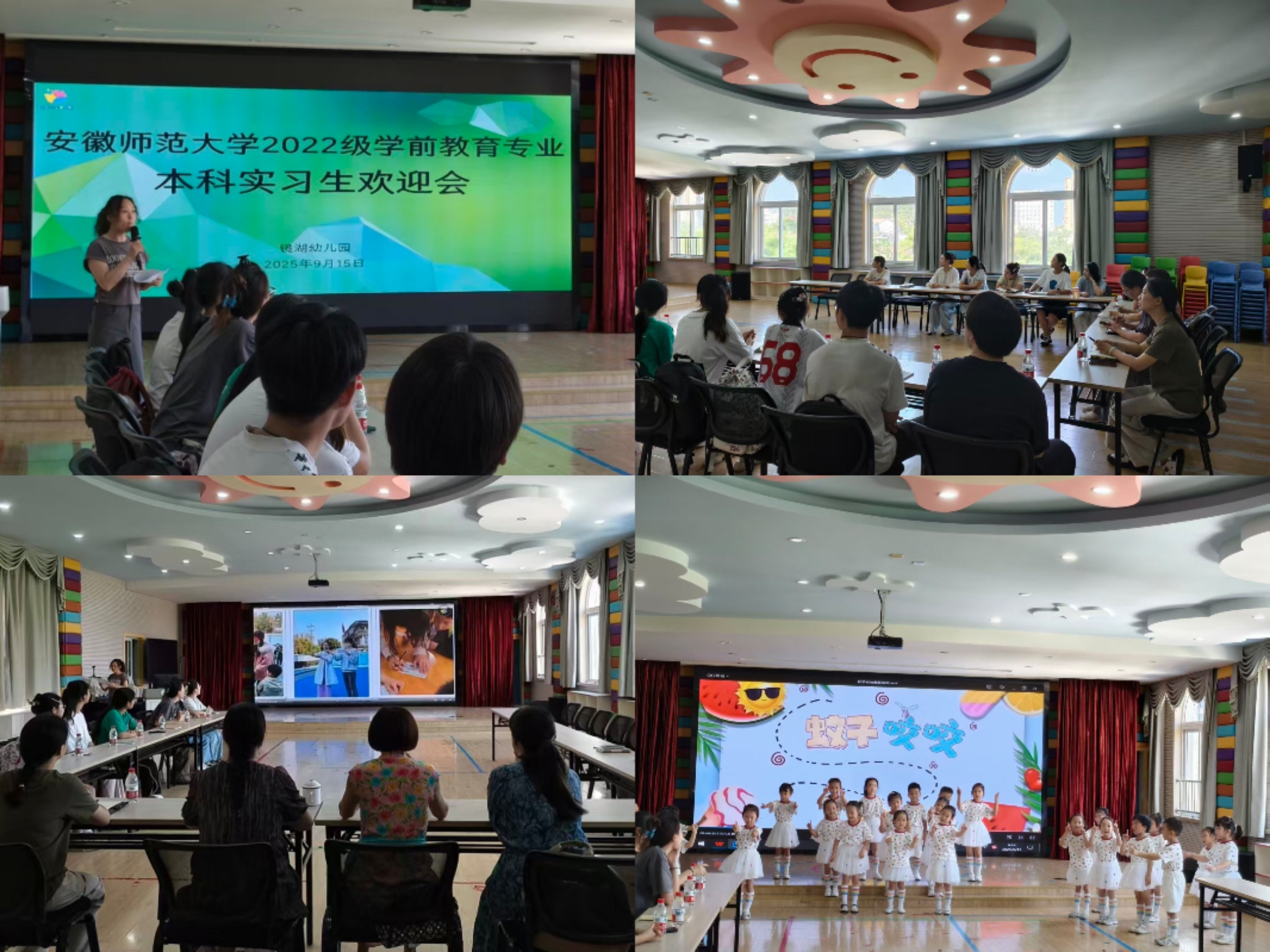许艳首先代表镜湖幼儿园全体师生,对安徽师范大学教科院赵学菊老师、张志华老师及9名本科生表示热烈欢迎,她表示幼儿园将全力为实习学生提供良好的学习与实践环境,助力大家在实习中收获成长。随后,大班幼儿带来欢迎节目《蚊子咬咬咬》,孩子们随着音乐翩翩起舞,灵动的舞姿、活泼的表情,赢得现场阵阵欢笑,也让实习学生感受到幼儿园师生的热情;紧接着,大家一同观看上届学长学姐的实习记录视频,视频中学长学姐们认真学习、积极实践的画面,为本届是师生提供了宝贵的实习参考,也让他们对未来的实习生活有了更清晰的认知。