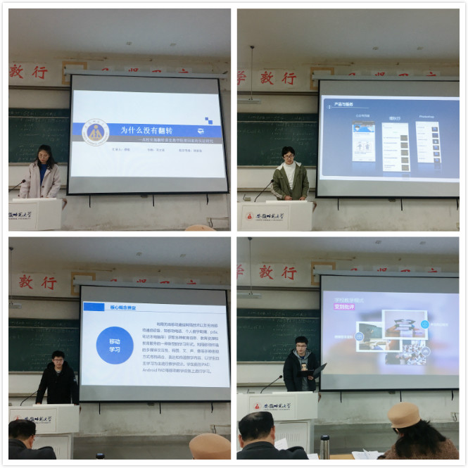 10位汇报人围绕“为什么没有翻转——高校实施翻转课堂教学阻滞因素的实证研究”、“新高考背景下贫困地区学校排课困境调查研究”、“‘互联网+’与城乡教师资源共享平台构建”、“游戏化学习课程设计研究——以《图形图像处理》课程为例”、“基于H5技术的移动端学习课件制作实践研究——以《高级语言程序设计》为例”、“贫富地区学校新高考选课走班比较研究”、“大数据视角下的指尖服务——个性化定制与推荐系统”、“校园自助果蔬鲜榨服务站”、“芜湖VR教育产品工作室”、“教育技术微课堂”主题展开汇报,各团队准备充分,ppt制作精良,汇报内容充实,回答思路清晰,给与会低年级学生提供了较好的示范作用。与会老师就项目选题、研究内容和目标、实施路径及预期成果等方面给出指导建议,为同学们后续研究的开展提供了十分有价值的参考。