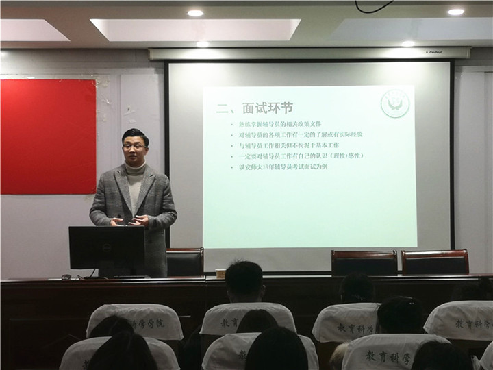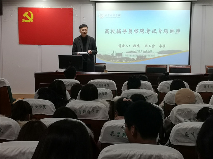本网讯(教科院 文/占陈芳图/杨银)为进一步促进研究生毕业生就业,提高我院就业率,2019年3月3日星期日下午2点半,我院研究生会顺利举办高校辅导员招聘考试专场讲座。本次讲座邀请了程啸(安徽金年会18级本科生辅导员)、张玉雪(安徽信息工程学院辅导员)和李佳(安徽商贸职业技术学院辅导员)三位辅导员主讲,学院准备参加辅导员考试的毕业生以及有备考意愿的学生参加了本次讲座,讲座由陈雅丽主持。