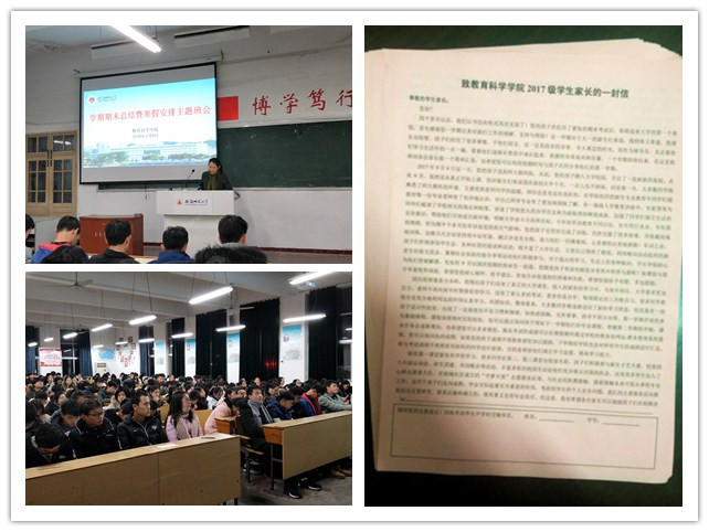 辅导员谭茹轩从学期总结、离校注意事项、寒假安排、返校事宜、重缓考要求等方面进行详细解读。着重强调假期安全问题,要求每位同学返乡后报告平安,提醒同学们注意假期往返途中及在家期间的交通及人身财物安全。为丰富假期生活,谭老师分别布置了读书、绘画、实践等结合各专业特色的寒假作业。并且鼓励同学们积极参与社会实践活动,充分利用宝贵的长假,查找不足,认真总结过去一学期的不足,并做好下学期计划。最后谭老师提前预祝同学们新春快乐,并将精心准备的《致学生家长的一封信》分发下去,叮嘱同学们回家后务必将信交给父母过目,目的是让家长深入了解孩子这一学期的在校情况,帮助促进每位学生成长成才。