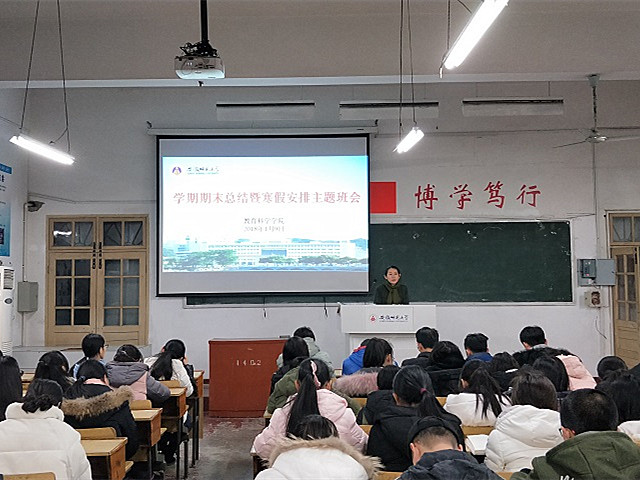 本网讯(教科院 谭茹轩)为切实做好假期前学生思想教育工作,帮助他们查缺补漏,做好规划,同时引导大一新生合理安排假期生活,1月9日晚,教科院2017级全体新生在教学楼1401教室召开了本学期最后一次主题班会,辅导员谭茹轩对本学期做认真总结,并细致交代了接下来的安排及假期注意事项。