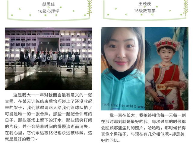 照片记录了我们成长的步伐,每一个回忆都是那么珍贵。既然时间不会停止他的步伐,那么用照片记录下每个美好的瞬间也是个很好的选择。在“最好的我们”中,女生选择上传自己认为在生活中最有意义的一张照片,同时为照片配上简单精致的描述,将自己美好而珍贵的回忆分享给他人,展现了我院女生自信的魅力。