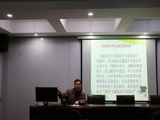 王守恒教授自1977年7月毕业留校任教至今已四十周年,是一位老教育学人,他认为教育学是研究教育现象和问题、把握教育本质和规律的一门学科。在讲座中,王教授从教育学专业发展的来龙去脉和如何适应从中学到大学的转变两方面内容与同学们展开交流。他从教育学专业设置依据、我国和我院教育学专业发展情况以及我院发展历史三个部分向同学们详述教育学专业的发展历程,旁征博引且风趣幽默。王教授嘱咐在座同学应对教科院这个大家庭的历史有所了解,介绍我院教育学专业是安徽省设置最早的教育学本科专业,并列举杨亮功、周辛等曾在此执教的著名专家学者以及王策三、李军等我院教育学专业培养出的大批专业人才和杰出代表,他强调一个专业的培养实力主要看所培养学生的发展情况。