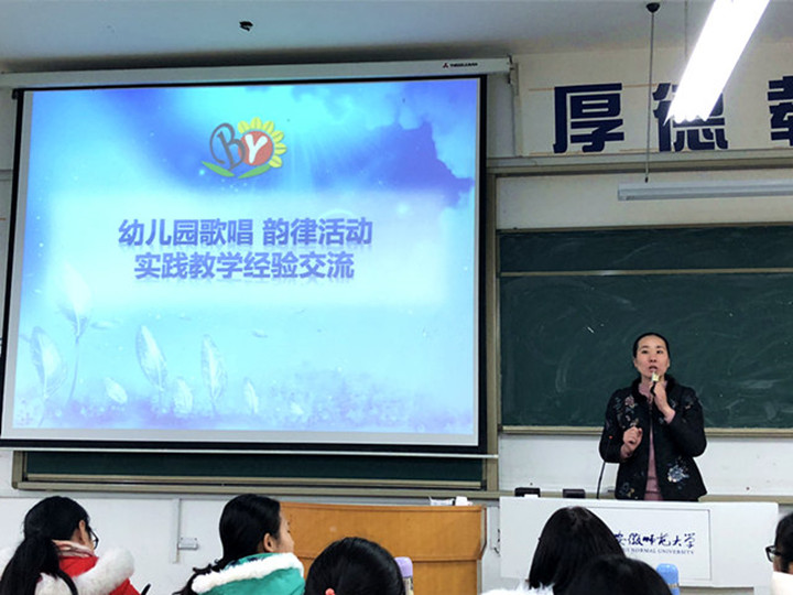 姜雪)2017年12月14日下午两点,在田家炳教育书院8202教室,2015级学前教育专业《学前儿童音乐教育》课程再次邀请一线优秀教师走进大学课堂教学。今天赵学菊老师为我们请到的主讲人是芜湖市百蕊幼儿园的杨斌园长,同时还邀请了芜湖师范学校幼儿园音乐教法任课教师王艳共同参与课程教学中。