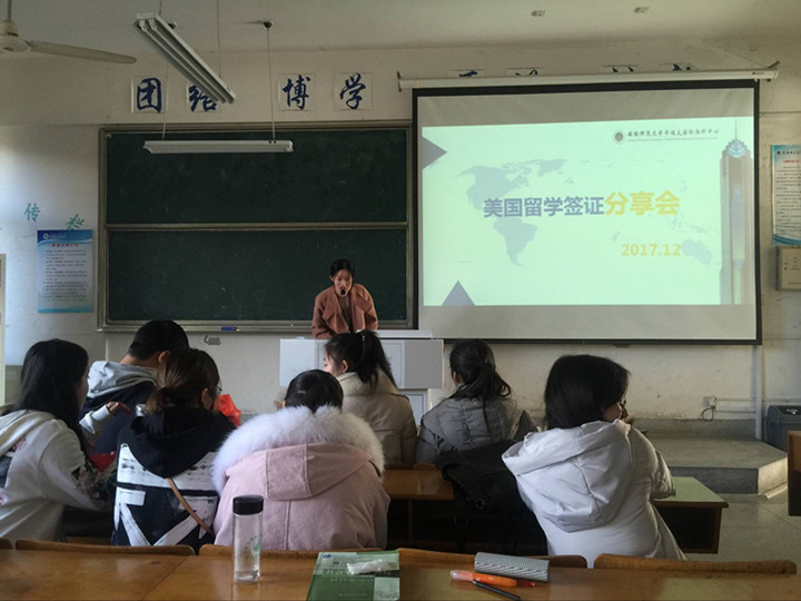 会上,朱芮就签证的含义、签证的类别、学生赴美签证办理的要求及相关注意事项向学生做了详细的解读。同学们也就赴美学习中的学业要求,身体健康要求,财产要求等问题与朱老师进行了交流。
