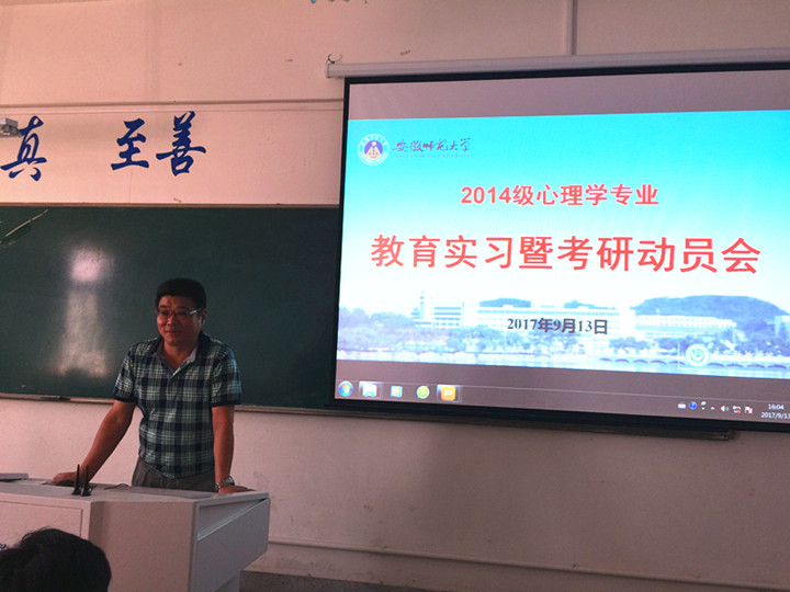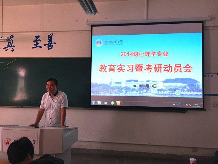 本网讯(教科院 孙文强)为进一步引导学生正确处理好实习和考研的关系,2014级心理学专业全体学生于9月13日在田楼8205教室召开了教育实习暨考研动员会,会议由心理学专业负责人方双虎教授主持,实习指导教师葛明贵教授、罗兴根副教授、李小平副教授、付梅老师、郭振娟老师、薛红利老师、孙文强老师出席了本次会议。