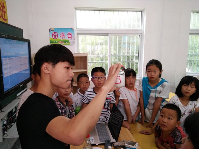为激发孩子们对自然科学的兴趣与热爱,培养其科学精神, 7月3日下午,团队成员为松岭小学的学生带去了一堂别开生面的趣味化学实验与生活知识课,从化学材料的生活用途常识讲起,到化学实验的操作步骤、注意事项、实验效果与鉴定,再到实际的实验演示。孩子们目不转睛地观察,竖起耳朵安静地听着支教者的讲解,兴趣浓烈时甚至凑到讲桌前围成了几层,近距离地观看着,等演示完毕时便回味无穷地有序坐回座位上。从孩子的目光中,团队成员看到得是他们难掩的惊奇。