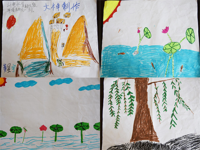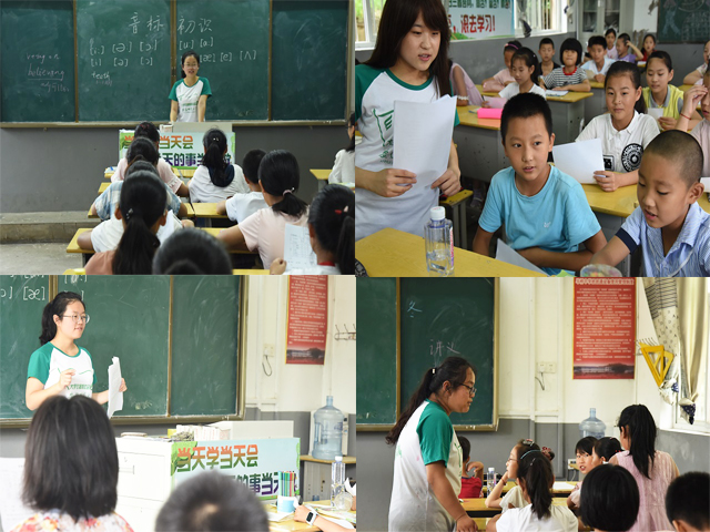 7月4日,美好的一天在孩子们朗朗的读书声中开始,从未上过讲台的刘娜娜同学克服紧张情绪,从容而自信地带领孩子们诵读经典课文。被孩子们亲切地称为“波波老师”的方文波同学则带来了一堂生动有趣的“初识音标”课,孩子们纷纷张大嘴巴竭力模仿老师的语音语调,在英语交流中感受学习的快乐。紧接着团队中最有亲和力的范晨晨同学用一堂创意诗文鉴赏课再一次将课堂气氛推向高潮,她不仅让孩子们开动脑筋去思考古诗的意境,更是让他们通过手中的画笔重新诠释对于古诗的理解,孩子们强大的想象力让他们创作出的画作赢得了每一位队员和在场老师的掌声和赞扬声。