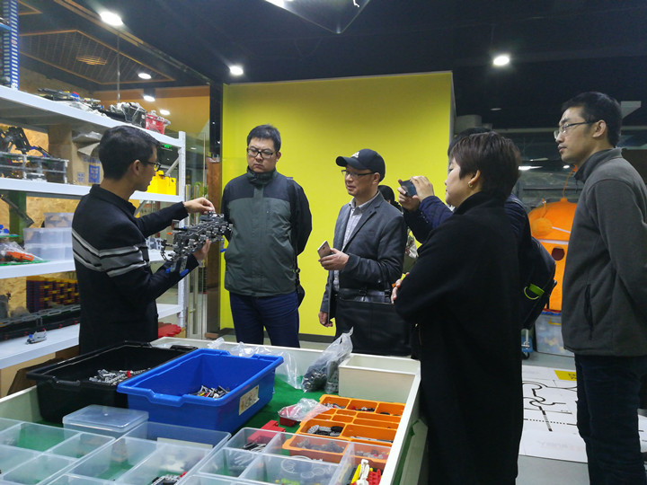 考察团第二站来到合肥睿趣疯狂机器人培训学校,校长黄飞对考察团一行表示热烈欢迎。该校是合肥成立较早规模较大的以机器人教育为特色的培训学校,考察团走访了该校机器人科技中心,双方就机器人教育在学前及小学阶段的培养模式、课程设置等问题交换了意见。