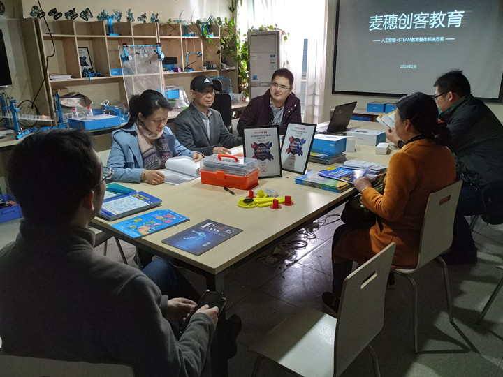 考察团第一站来到麦穗创客教育(科大讯飞子公司),中国科技新闻学会副理事长、中国科技大学管理学院科普产业研究所所长周建强及麦穗创客教育总经理兰鲁光对考察团一行表示热烈欢迎。考察团重点调研了该公司的创客空间和创客产品,并就我院创客教育苗圃的建设、相关课程的设置及创客教育设备的配套等问题与对方进行了深入交流。
