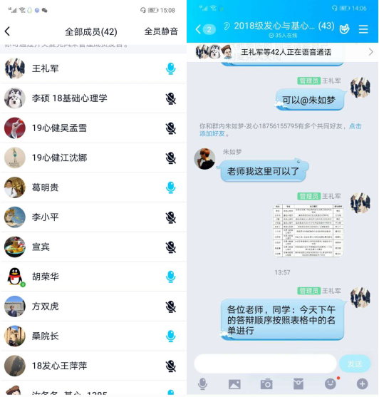 张威威 王礼军/202046日(星期一)下午2点,我院2018级基础心理学和发展与教育心理学硕士研究生在班级QQ群举行了线上开题指导会。出席本次开题指导会议的专家有:桑青松教授、葛明贵教授、方双虎教授、宣宾教授、胡荣华副教授、李小平副教授。王礼军博士担任本次开题指导会的秘书。18级基础心理学和发展与教育心理学共10位同学进行开题汇报,部分19级心理学研究生加入QQ群旁听学习。