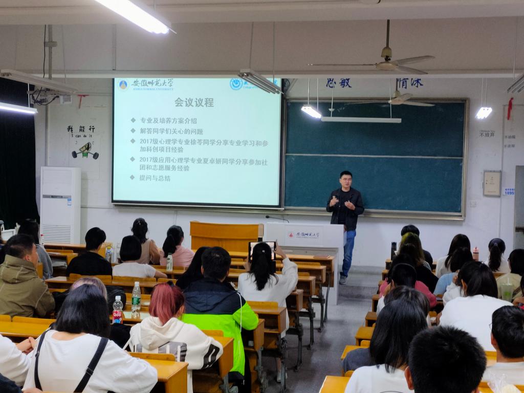 本网讯(文图/胡晨)为使2020级心理学专业新生全面了解所学专业,尽快适应即将开始专业学习,2020年10月11日晚,心理学专业于8210教室召开了新生专业入学教育大会。全体2020级心理学本科新生以及高年级学生代表参加活动,会议由心理学本科专业负责人韩建涛老师主持。