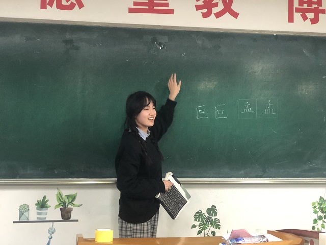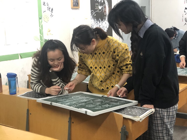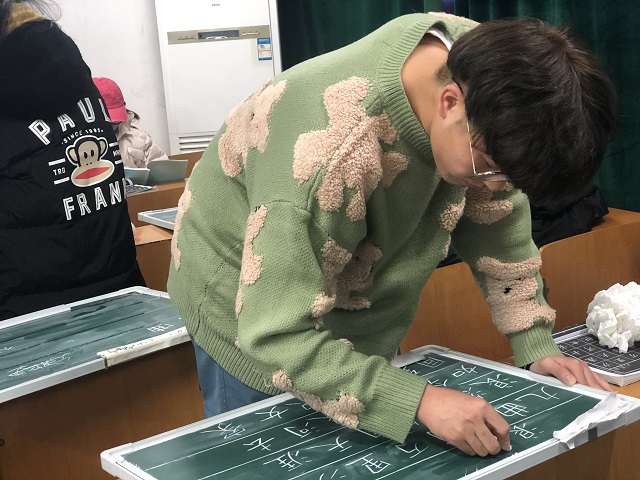 本网讯(文/于硕 图/于硕)为进一步强化师范生黑板字书写能力,增强学生的基础素质,12月14日晚,18级教育学讲字活动在田楼8401教室顺利开展。练字工作组成员吴君瑜担任本次讲字活动的主讲人,18级袁慧,19级徐馨宇、张羽西负责现场指导工作。