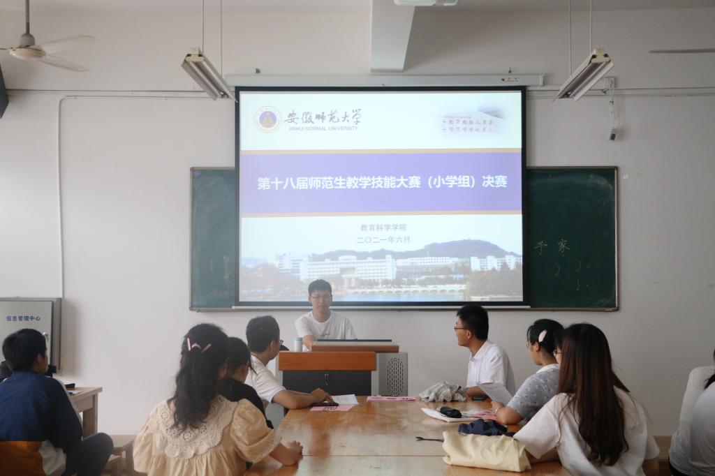本网讯(教科院 杜安)6月6日,安徽师范大学第十八届师范生技能大赛(小学组)于赭山校区田家炳教育书院成功举办。本次比赛由教育科学学院承办、小学教育专业负责人王芳老师与2020级小学教育班委会组织实施。莅临本次大赛的专家评委均为芜湖市小学一线优秀教师。 2018、2019级小学教育和教育学学生参与此次比赛。