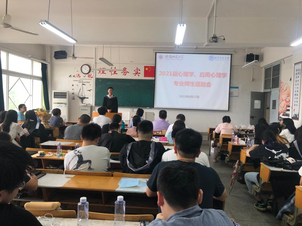 话别会第二阶段,参会老师和领导们给同学们送出了毕业赠言。心理学专业桑青松教授期许同学们敢当心中有光的追梦者、善为德行兼修的笃行者、勇做胸怀家国的奋进者。葛明贵教授表达对同学们成长的肯定,鼓励大家可以自信地走入社会。方双虎、宣宾、郑筱妍、丁园园、郭振娟、刘伟芳和舒首立等老师也都回忆了和同学们相处的点点滴滴,真诚地希望大家继续谦虚奋进,不负青春,不负韶华。