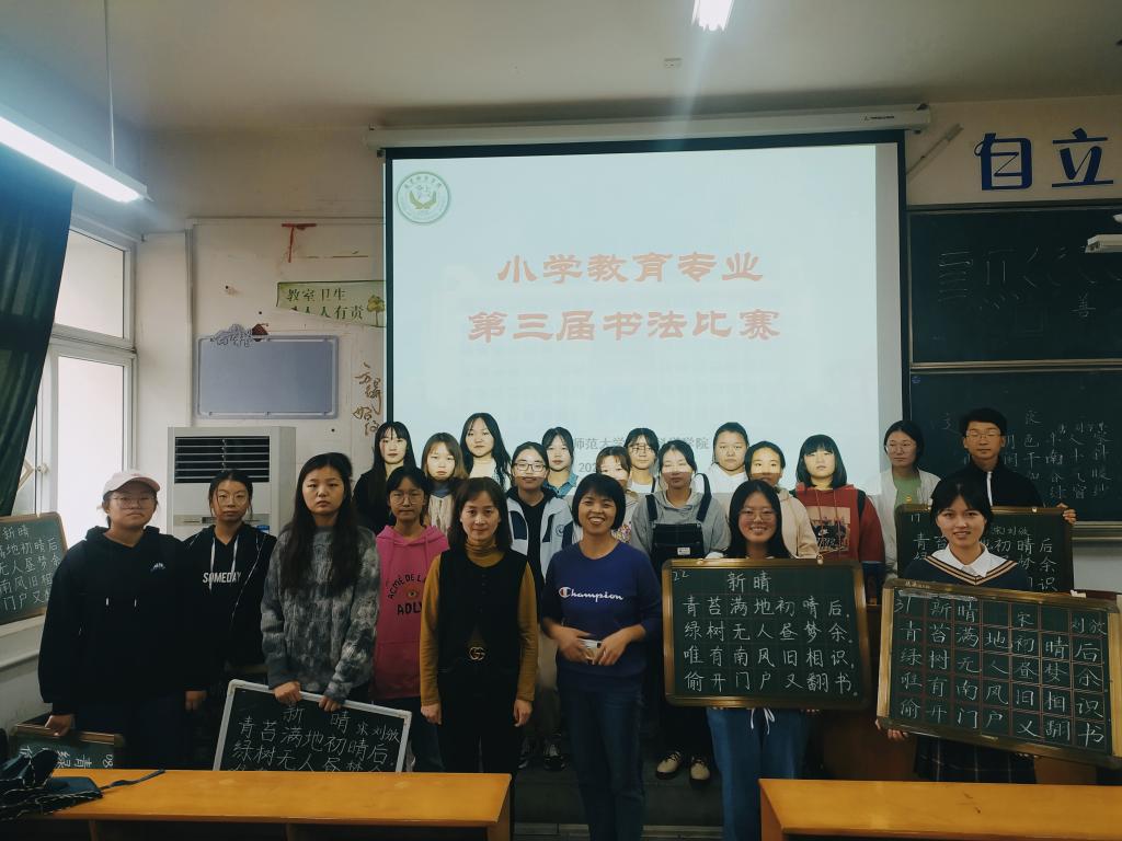 本网讯(教科院 王盟)20211016日上午小学教育(全科)专业第三届书法比赛在田楼8210教室展开。该比赛旨在提高小学教育专业同学的汉字书写水平,给同学们一次以展现自我的机会。本次比赛由2018级小学教育班委成员负责组织,面向小学教育全体同学。专业负责人王芳老师莅临指导,安徽师范大学附属小学尹娟娟老师以及18级、20级书法委员担任本次比赛的评委。