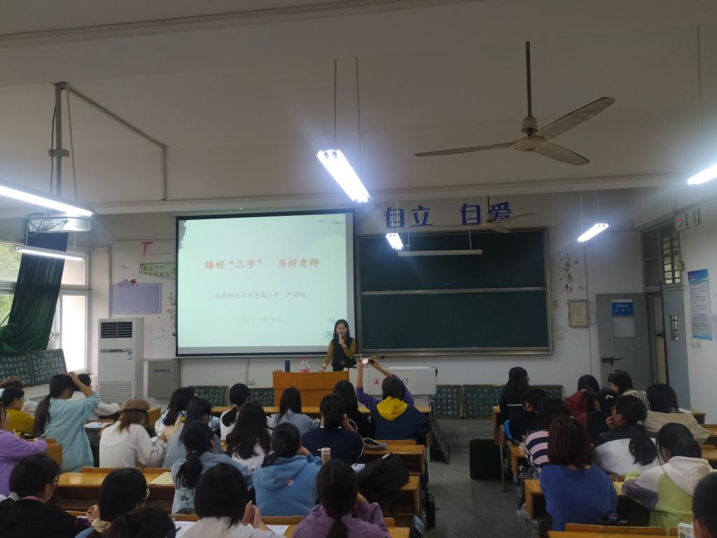 尹娟娟老师是安徽省书法协会会员,也是安徽师范大学附属小学优秀的语文和书法老师。讲座上,尹老师强调,书法教育愈加紧迫,想要成为一名优秀的老师,练好书法非常重要。尹老师结合自己的工作经验,针对比赛中同学们的书写状况,归纳出钢笔字、粉笔字书写中存在的问题,并给同学们找到了具体的解决方法,想要写好字,临摹必不可少,其次笔画是基础,控制好速度,注意上下左右结构,学会抓主笔,大小要统一,还要注意书写时捻转粉笔,注意排版,切勿随意涂改等注意事项。而同学们也提出了自己在练习书法当中遇到的问题和疑惑,尹老师也都做出了针对性的解决方案,逐个击破。最后请几位同学上台示范书写粉笔字,尹老师给出专业的建议和评价,将同学们易犯的书写错误和一些易错字的基本笔画都详细讲解。同学们也都听得津津有味,不亦说乎,原来从前觉得枯燥的书法练习还有这么有趣的一面。