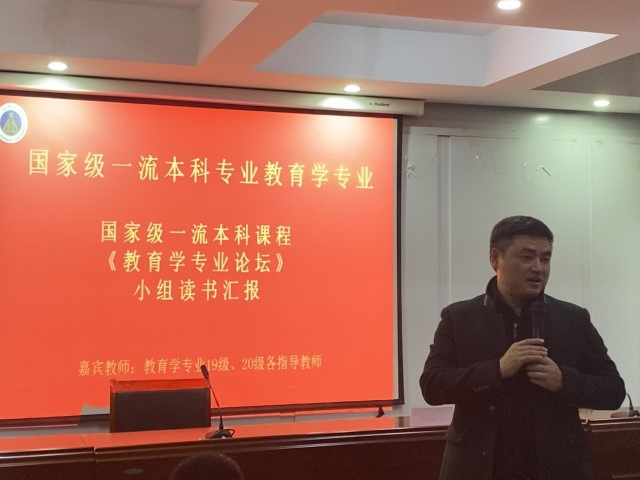 本网讯(文/张思雪 图/谢雅雯)1128日晚,国家级一流本科专业建设点教育学专业一年一度的小组活动汇报会在学院三楼学术交流中心顺利举行。此次汇报会是连续举办的第九次汇报会。19级、20级教育学全体本科生及21级教育学类部分同学参加活动,读书小组指导教师周兴国、段兆兵、姚运标、李宜江、辛治洋、陈娜、滕曼曼、薛卫洋及教育学专业负责人徐赟应邀出席此次活动。20级教育学江宇翼担任汇报会的主持人。