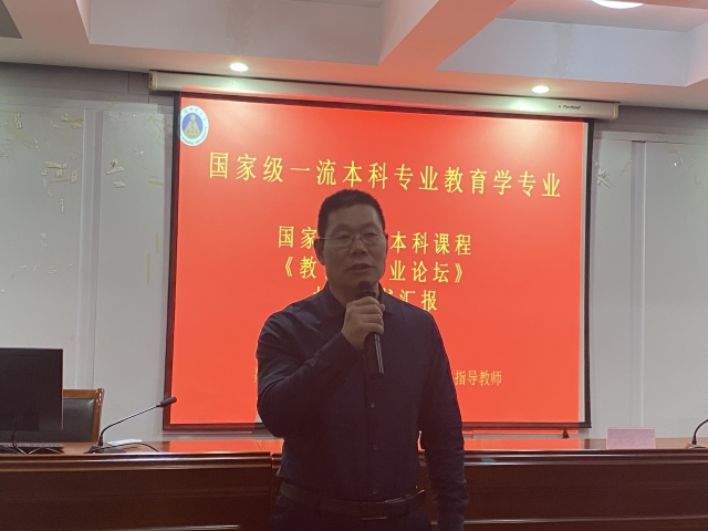 精彩的汇报结束后,进入教师点评环节。段兆兵首先从“全”字切入,总结本次小组活动汇报会的特点。其一,全员参与;其二,小组活动全过程记录与回顾,此次汇报可供小组之间交流借鉴经验,监督促进提高;其三,全方位展示小组特色,组名介绍多样化,成员介绍多途径。其次他以“格”字为纲,从“入格-定格-出格”的角度既肯定课程建设成果,又指出再提升的必要性。紧接着他以“特”字为结,既以小组命名为例赞赏读书小组有特色,又结合小组阅读书目从偏睐西方资产阶级教育名著到关注中国本土和马克思主义教育著作的变化,指出此次小组读书的特点,也表示新的期待,期望大家在阅读中有所收获和启发。最后,他勉励同学们把握机会,抓紧时间下足功夫,扎扎实实地学,也祝愿教育学专业越办越好!