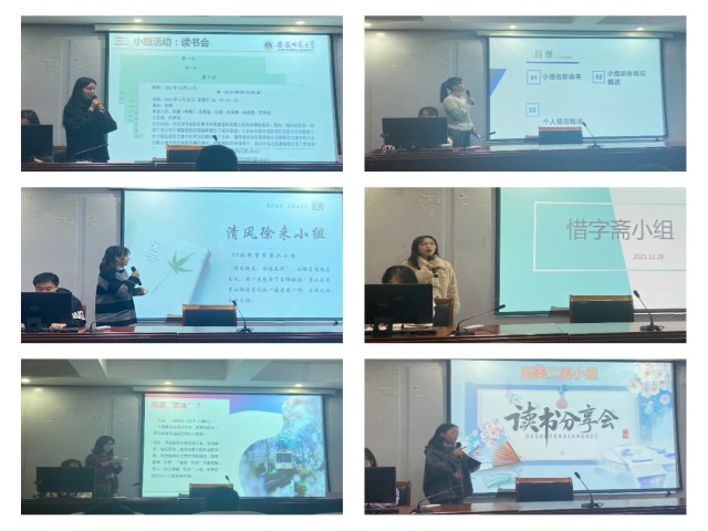 首先,第一个汇报的是五枝精珠小组,指导教师是陈娜。汇报人张慧从导师及五位成员介绍、小组读书历程、小组活动和成果分享四个方面展开详细讲解。第二个汇报的是清风“徐”来小组,指导教师是徐群。汇报人李佳欣从导师介绍、小组成员介绍、小组活动进行汇报。第三个汇报的是“饮冰”小组,指导教师是段兆兵。汇报人曾妍姿以“饮冰”之源、可爱可敬的导师、小组里的那些人、读过的书为序展开汇报。第四个汇报的是“勤时明月”小组,指导教师是路宝利。汇报人纪岚向大家介绍了小组名称由来、小组总体情况概述、个人情况概述和小组寄语。第五个汇报的是“书海拾贝”小组,指导教师是辛治洋。汇报人王越从导师介绍、小组成员介绍、小组所读书目、小组活动四个方面展开汇报。第六个汇报的是“惜字斋”小组,指导教师是薛卫洋。小组结合视频对小组导师和小组成员进行介绍,汇报人张思雪对小组名称由来、小组活动介绍、小组学习情况、小组所读书目进行汇报。第七个汇报的是“四美二男”小组,指导教师是姚运标。汇报人梅文娟分别从成员板块、阅读板块、活动板块三个方面展开介绍。第八个汇报的小组是“缘缘堂”小组,指导教师是周兴国。汇报人张紫涵向大家介绍了小组名称来源、小组导师简介、小组成员、小组活动概况。第九个汇报的是“书”途同归小组,指导教师是滕曼曼。汇报人许帆从导师介绍、小组成员介绍、精读与涉猎书目、小组活动等方面介绍小组特色。第十位汇报的是浅陌初心小组,指导教师是杨晓奇。汇报人陈海龙从组名介绍、导师介绍、成员介绍、读书汇报、日常分享和未来计划展开汇报。第十一位汇报的是“三余”读书小组,指导教师是李宜江。汇报人程俊对成员介绍、已读书目、学习成果、未来展望四个方面进行汇报。第十二位汇报的是尚昕小组,指导教师是李卯。汇报人江宇翼介绍了小组名称来由、小组导师、小组成员、小组活动情况等内容。