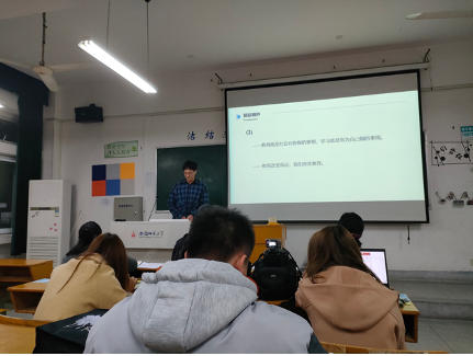 其次,各小组代表成员共计18名依次上台进行读书汇报。读书汇报的主题多种多样,同学们有的就教育的第四次革命进行了汇报有的同学就如何开发大脑进行了汇报,有的同学就《人类简史》的心得感悟进行了汇报。各小组代表成员积极地向同学们分享自己在读书中的感悟以及领悟,激起了20级教育技术学专业1班全体同学的学习兴趣、读书兴趣。整场汇报在老师和同学们的共同努力下高效有序进行。