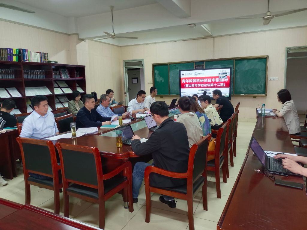 2022年5月20日下午,“赭山青年学者论坛”(第十二期)以线上线下相结合的方式在教科院408会议室如期开讲。为进一步和有针对性地推动青年教师申报安徽省哲学社会科学项目工作,此次论坛主题特定为“青年教师科研项目申报辅导”,特邀安庆师范大学曹长德教授,教育科学学院阮成武教授、李宜江教授、赵必华教授参加指导。论坛由吴文涛副院长主持。