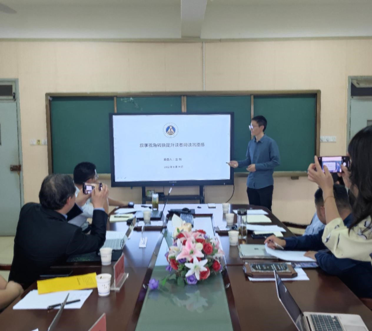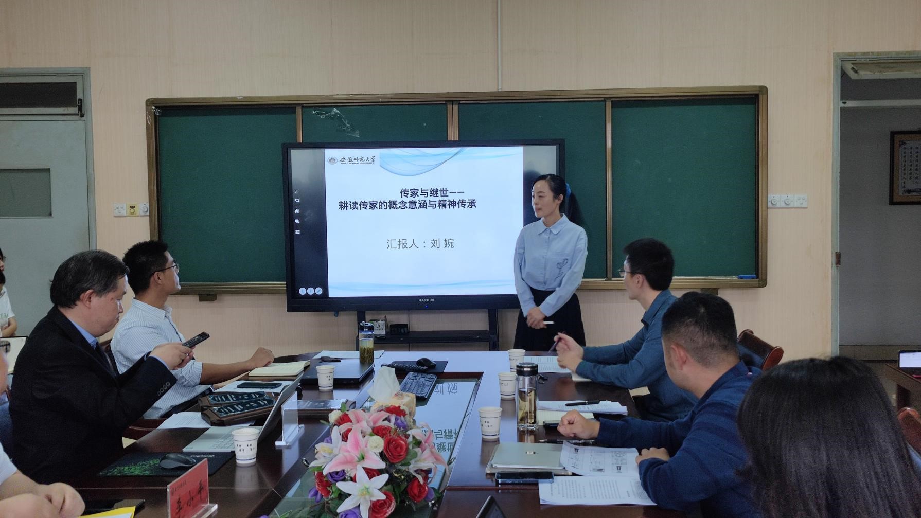 在呼应环节,吴玲教授、方双虎教授以及宣宾教授分别就三位老师的报告给予了中肯的点评并进行了提问,同时为新入职教师颁发了纪念品。吴玲教授肯定了刘婉老师撰写的主题,她指出在“耕读传家”的时代转化部分,需要进一步思考现实转化的困境,实施空间在何处?她建议可以拓宽研究思路,对每一部分内容做系列解读。方双虎教授认为谢宇老师提出的“三环”模式内容非常丰富,并且就家校社协同推进高校心理健康教育呈现的特征与谢宇老师进行了交流。宣宾教授表示金剑老师的研究思路清晰,实验内容丰富,观点也很新颖,建议后续能将文学的价值与教育学的价值结合起来思考问题,后期也很期待与他进行更深层次的交流。在座师生表示深受启发,现场研讨气氛轻松活跃。