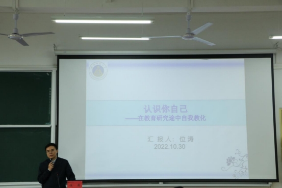 讲座伊始,位涛博士以回忆自身经历作为切入点,引发各位同学思考读研的初衷。紧接着,围绕着“认识你自己”这一主题,提出应当怎样认识你自己,并引经据典,呼吁同学们站在前人的肩膀上认识世界。不仅如此,位涛博士还提出自我教化是一种认识自己的路径选择,指出各位同学需要保持无知之知,对知识保持敬畏之心,不要为了短暂的功利而成为一名精致的利己主义者。此外,位涛博士将自我教化与教育研究结合起来,指出教育研究的成果是自我与文本的双重显现,教育研究本身就是一种自我磨砺和修炼的过程。最后,位涛博士对2022级全体硕士研究生寄予期望,希望各位同学树立目标,清楚定位,思考自己日后将成为什么样的研究生。