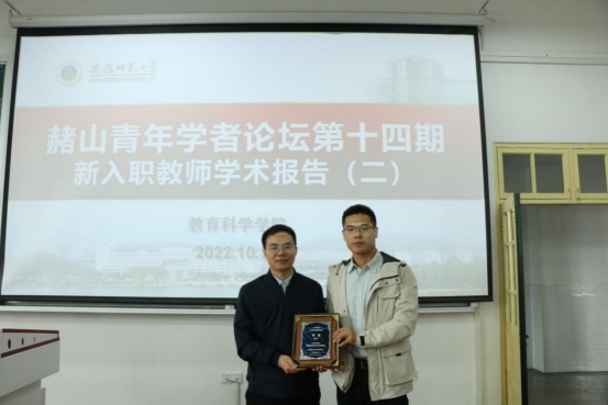 本网讯(文 何锦欣/图 杜怡凡 陈雨)10月30日上午,“赭山青年学者论坛”(第十四期)在教学楼1401教室如期开讲,新进教师位涛博士进行了主题为《认识你自己——在教育研究途中自我教化》的学术报告。副院长吴文涛、青年教师杨俊铨,学院2022级全体硕士研究生200余人参加。本期论坛由2022级研究生陶瑞瑞主持。