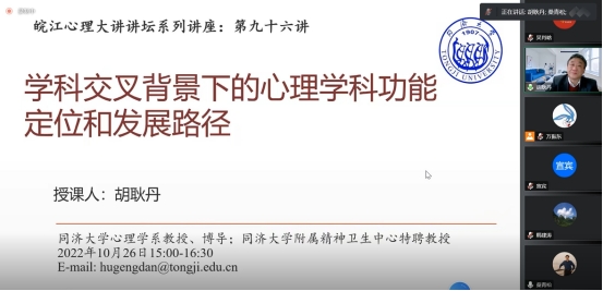 10月26日下午,同济大学心理学系学科带头人、博士生导师胡耿丹教授应邀做客我院皖江心理大讲坛第九十六讲,为我院师生作《学科交叉背景下心理学科的功能定位和发展路径》的学术讲座。讲座由我院博士生导师桑青松教授主持,心理学系教师以及全体心理学硕士和部分博士研究生线上聆听学习。