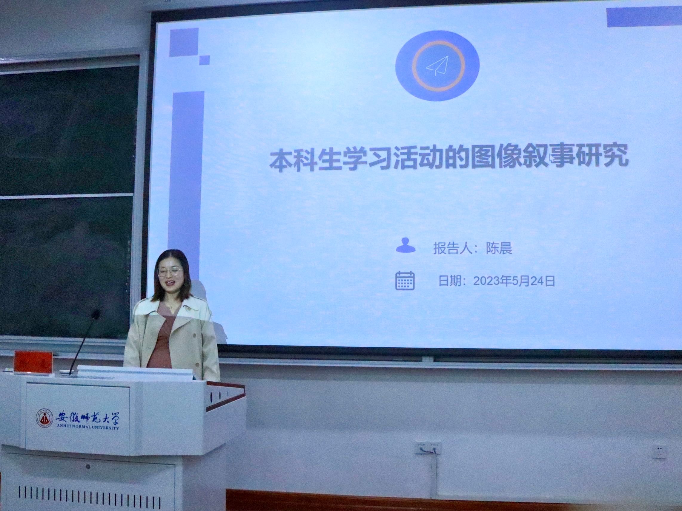 5月24日下午,“赭山青年学者论坛”(第二十三期)在教学楼1401教室如期开讲。新进教师陈晨博士受邀为在场师生带来了主题为《本科生学习活动的图像叙事研究》的学术报告。副院长吴文涛以及2022级全体硕士研究生到场学习。本期论坛由2022级研究生张乃迎主持。