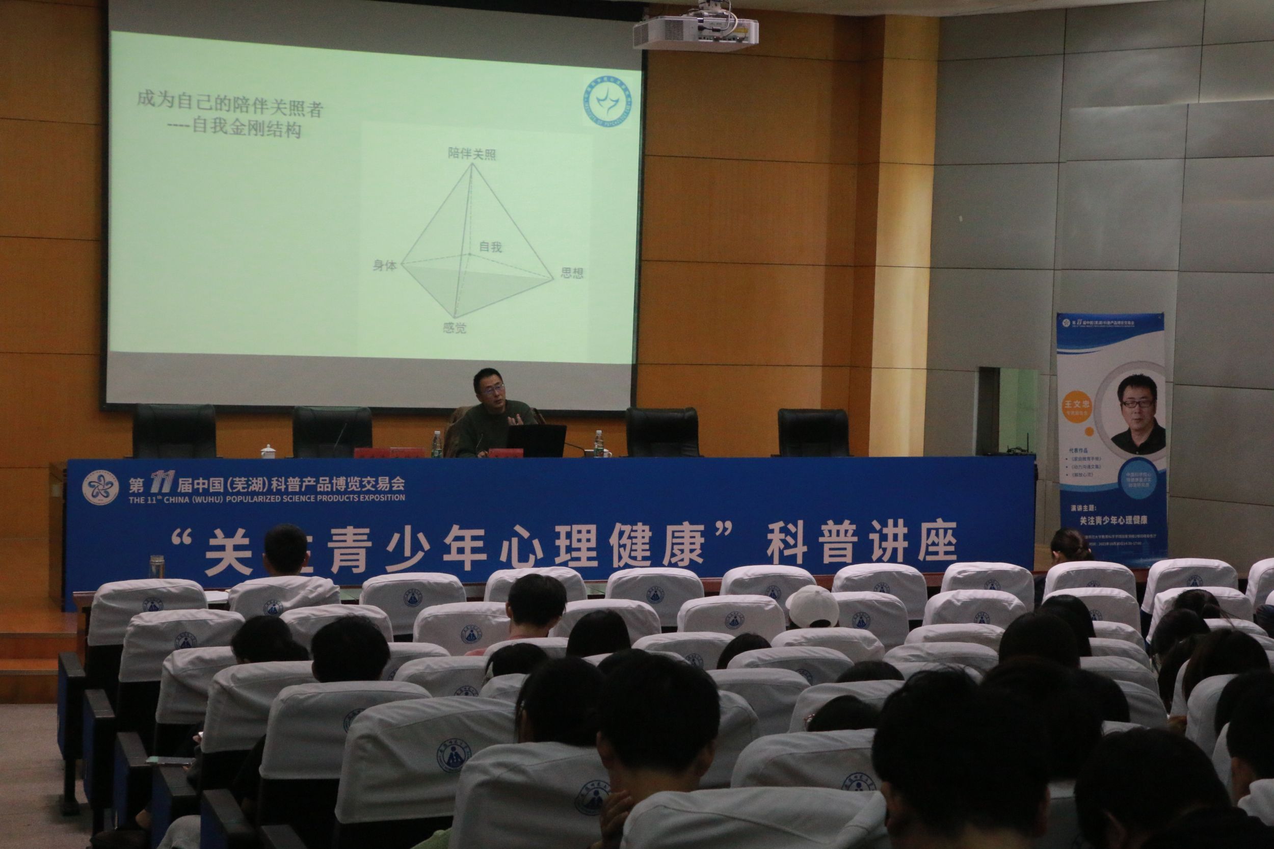 10月20日下午,第十一届中国(芜湖)科普产品博览交易会科学教育进校园主题实践暨皖江心理大讲坛第一百零五讲“关注青少年心理健康”科普讲座在田楼报告厅举行。中国科学院心理健康重点研究室研究员、心理研究所沟通研究室中心主任王文忠应邀做了一场题为《关注青少年心理健康的关键:打造自我金刚结构》的学术讲座。讲座由学院副院长韩建涛老师主持,心理学专业本科生和研究生200余人到场学习。