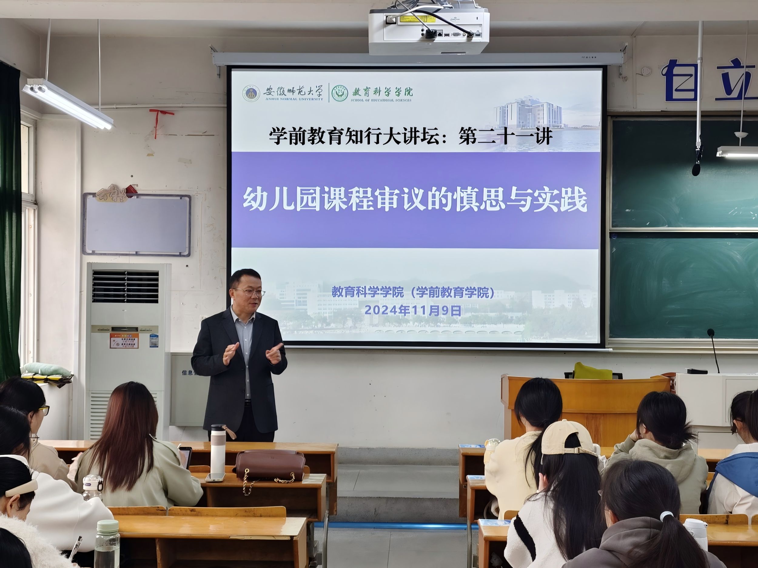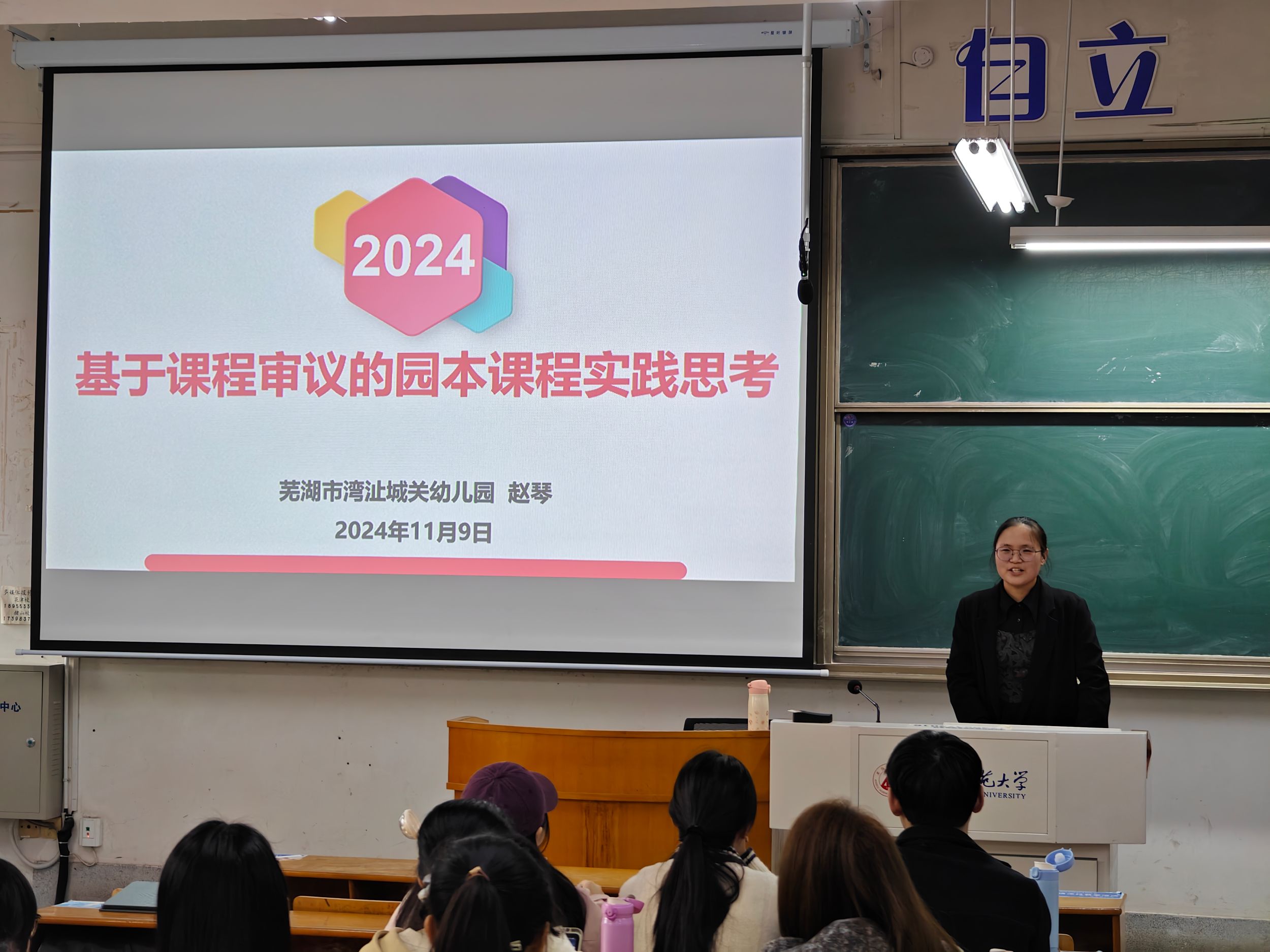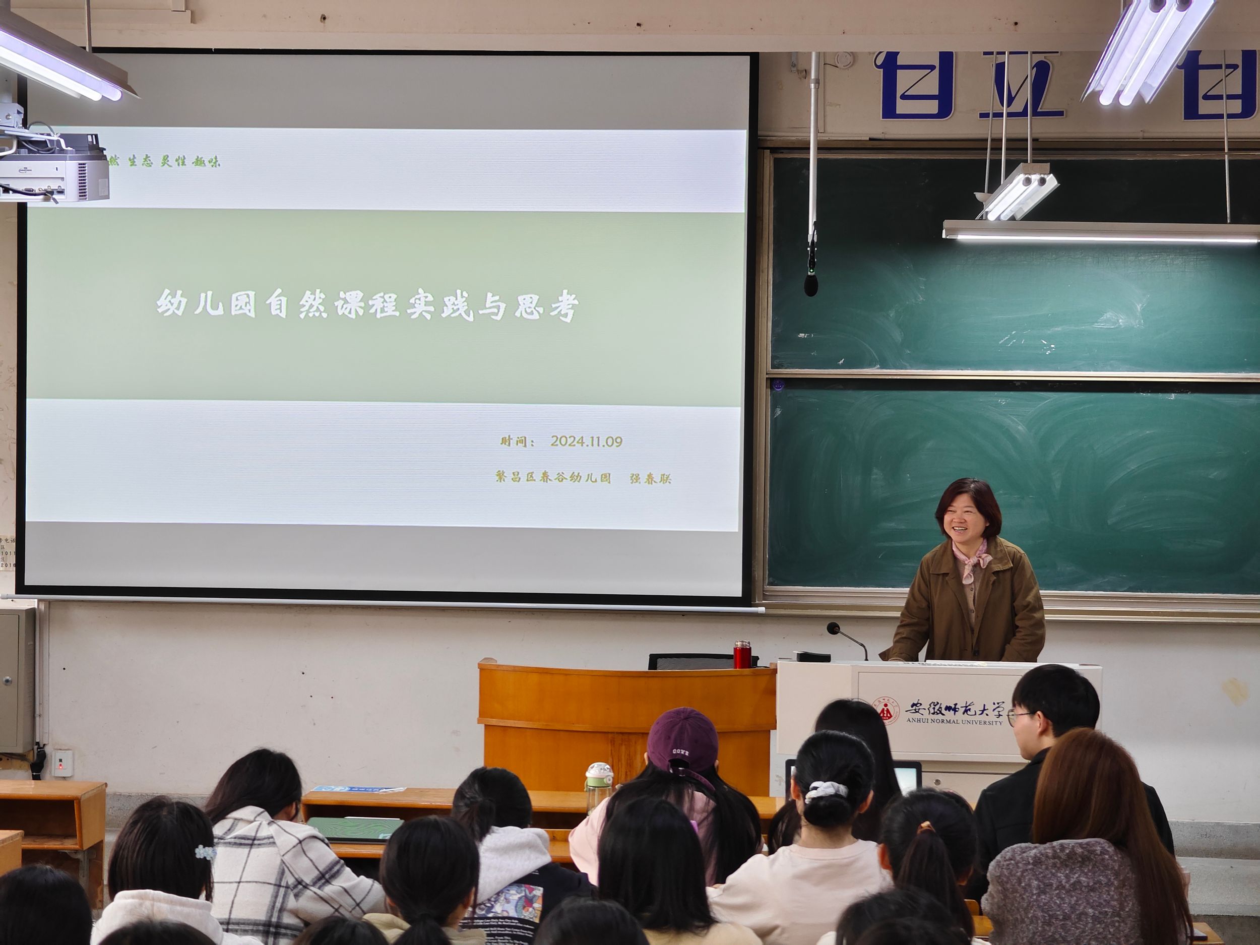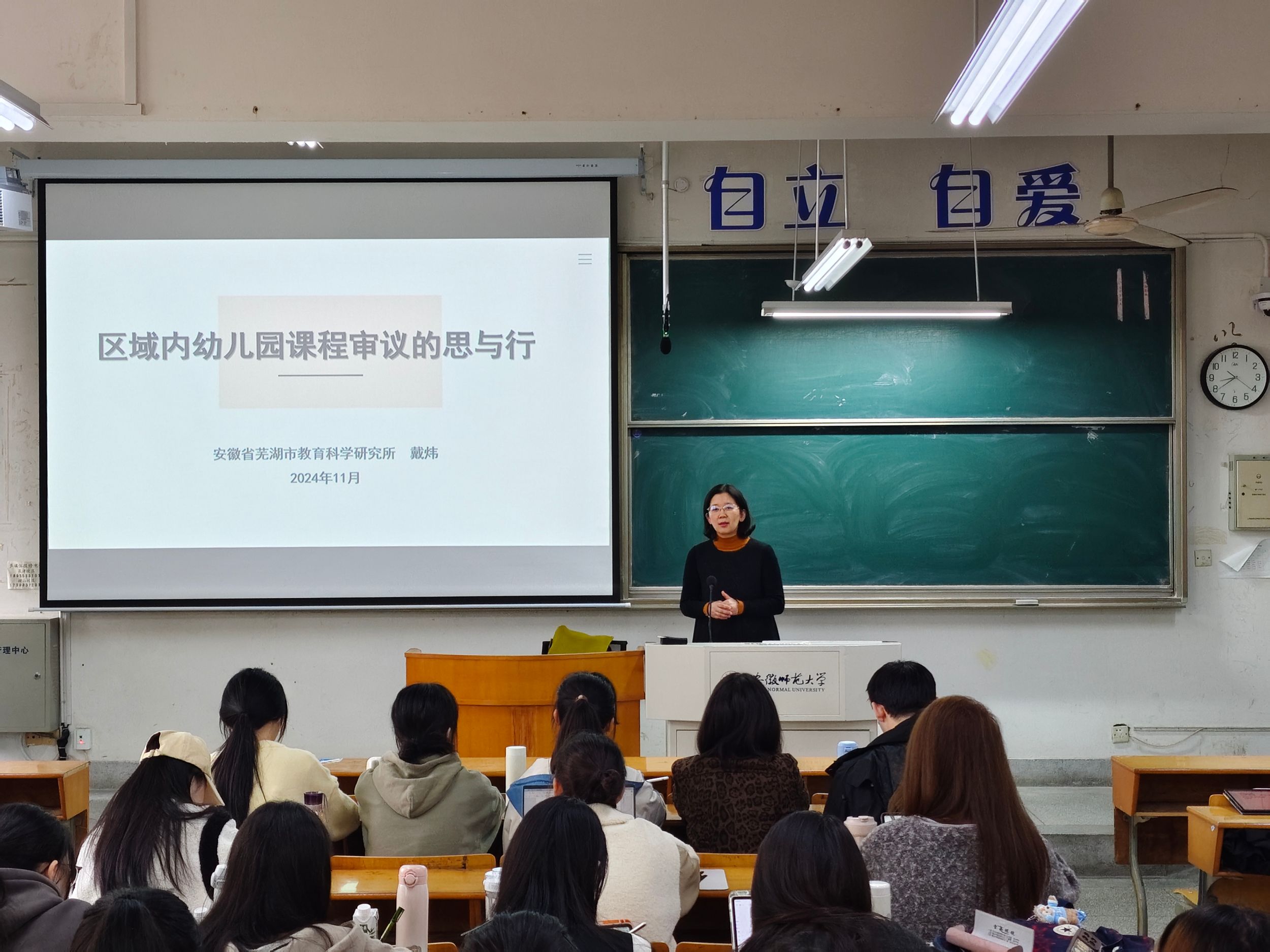 2024119日,学前教育知行大讲坛第二十一讲在田楼8210教室举行。本次讲座邀请芜湖市教育科学研究所副所长、硕士生导师戴炜,繁昌区春谷幼儿园园长强春联、湾沚城关幼儿园园长赵琴,围绕《幼儿园课程审议的慎思与实践》为我院师生做了三讲专题讲座。讲座由教育科学学院(学前教育学院)副院长张更立教授主持,2023级、2024级学前教育研究生及部分本科生到场学习。