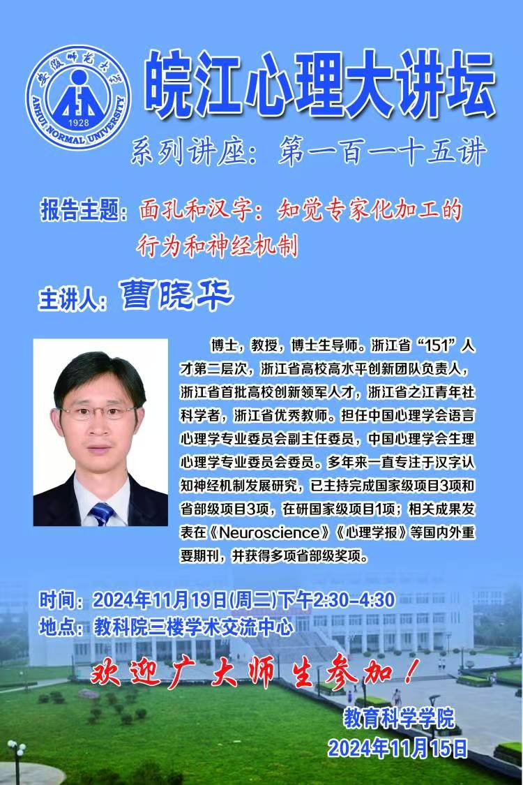 【学术预告】皖江心理大讲坛第一百一十五讲——曹晓华:面孔和汉字:知觉专家化加工的行为和神经机制