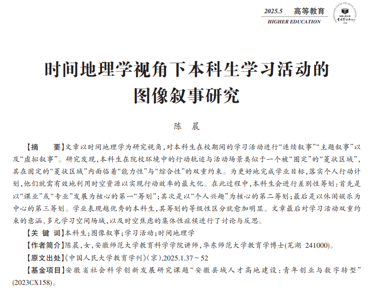 文章以时间地理学为研究视角,对本科生在校期间的学习活动进行“连续叙事”“主题叙事”以及“虚拟叙事”。 研究发现,本科生在院校环境中的行动轨迹与活动场景类似于一个被“圈定”的“菱状区域”,其在固定的“菱状区域” 内面临着“能力性” 与“综合性”的双重约束。 为更好地完成学业目标,落实个人行动计划,他们就需有效地利用时空资源以实现行动效率的最大化。 在此过程中,本科生会进行差别性筹划:首先是以“课业”或“专业”发展为核心的第一“筹划”;其次是以“个人兴趣” 为核心的第二筹划;最后是以休闲娱乐为中心的第三筹划。学业表现越优秀的本科生,其筹划的等级性区分就愈加明显。 文章最后对学习活动双重约束的意涵、多元学习空间场域,以及时空焦虑的集体性症候进行了讨论与反思。