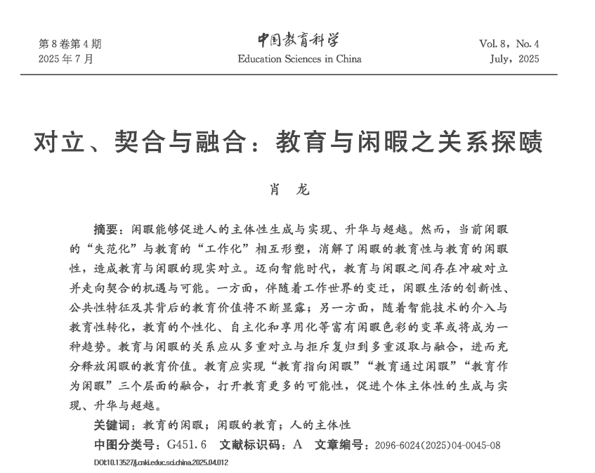 闲暇能够促进人的主体性生成与实现、升华与超越。然而,当前闲暇的“失范化”与教育的“工作化”相互形塑,消解了闲暇的教育性与教育的闲暇性,造成教育与闲暇的现实对立。迈向智能时代,教育与闲暇之间存在冲破对立并走向契合的机遇与可能。一方面,伴随着工作世界的变迁,闲暇生活的创新性、公共性特征及其背后的教育价值将不断显露;另一方面,随着智能技术的介入与教育性转化,教育的个性化、自主化和享用化等富有闲暇色彩的变革或将成为一种趋势。教育与闲暇的关系应从多重对立与拒斥复归到多重汲取与融合,进而充分释放闲暇的教育价值。教育应实现“教育指向闲暇”“教育通过闲暇”“教育作为闲暇”三个层面的融合,打开教育更多的可能性,促进个体主体性的生成与实现、升华与超越。