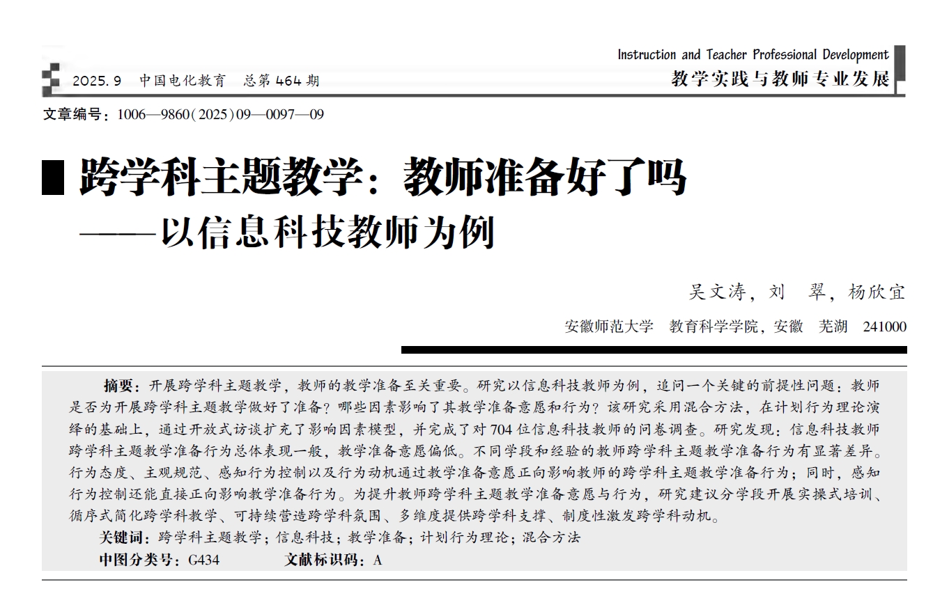 开展跨学科主题教学,教师的教学准备至关重要。研究以信息科技教师为例,追问一个关键的前提性问题:教师是否为开展跨学科主题教学做好了准备?哪些因素影响了其教学准备意愿和行为?该研究采用混合方法,在计划行为理论演绎的基础上,通过开放式访谈扩充了影响因素模型,并完成了对704位信息科技教师的问卷调查。研究发现:信息科技教师跨学科主题教学准备行为总体表现一般,教学准备意愿偏低。不同学段和经验的教师跨学科主题教学准备行为有显著差异。行为态度、主观规范、感知行为控制以及行为动机通过教学准备意愿正向影响教师的跨学科主题教学准备行为;同时,感知行为控制还能直接正向影响教学准备行为。为提升教师跨学科主题教学准备意愿与行为,研究建议分学段开展实操式培训、循序式简化跨学科教学、可持续营造跨学科氛围、多维度提供跨学科支撑、制度性激发跨学科动机。