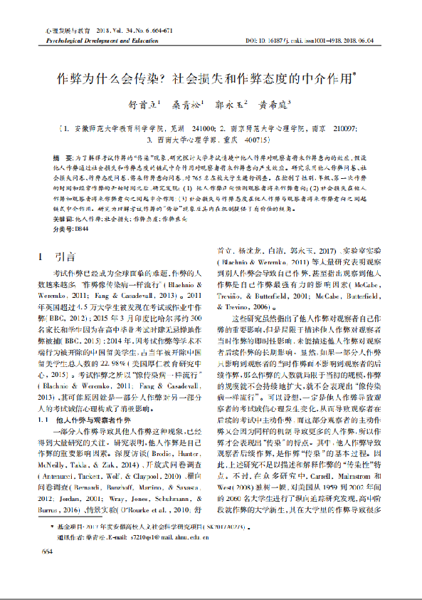 作弊为什么会传染_社会损失和作弊态度的中介作用_舒首立.pdf