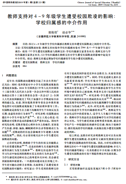 郭俊俏,赵必华:教师支持对 4 ~ 9 年级学生遭受校园欺凌的影响:学校归属感的中介作用