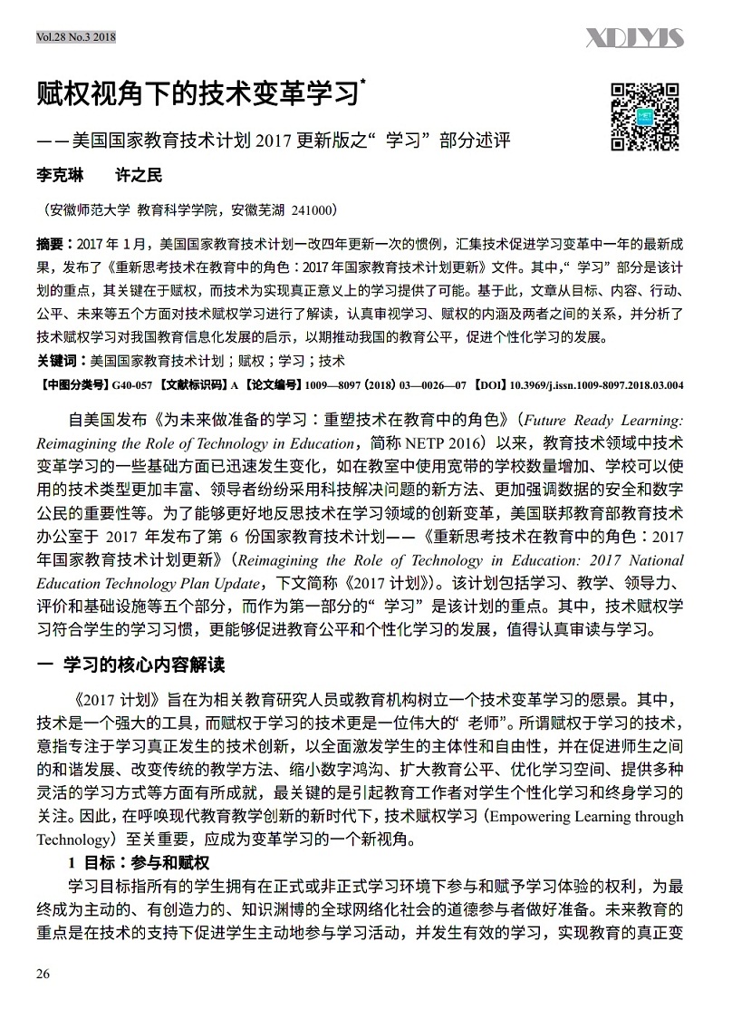 许之民:赋权视角下的技术变革学习——美国国家教育技术计划 2017 更新版之“学习”部分述评