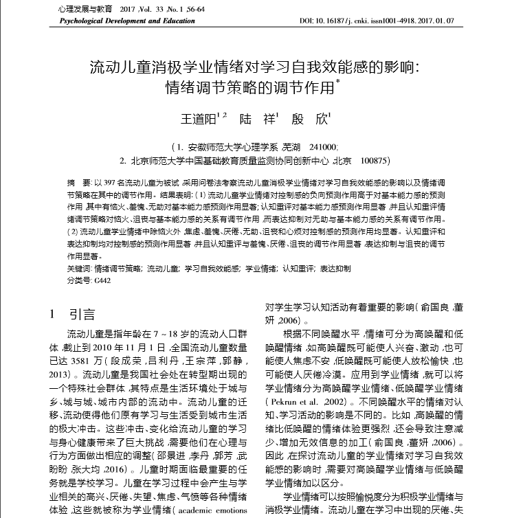 流动儿童消极学业情绪对学习自我效_省略_感的影响_情绪调节策略的调节作用_王道阳.pdf