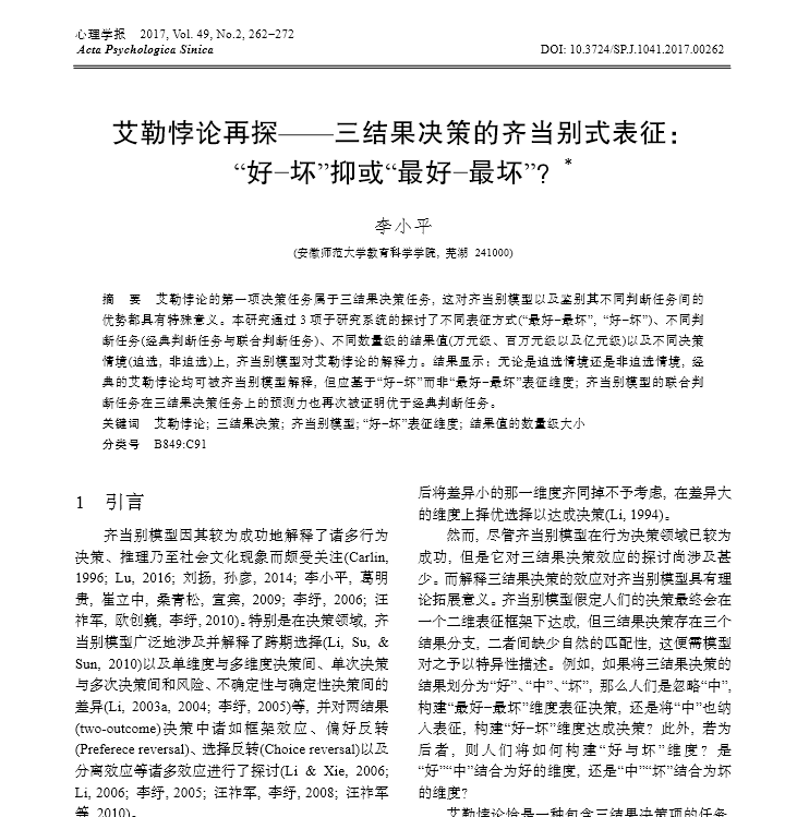李小平:艾勒悖论再探——三结果决策的齐当别式表征: “好?坏”抑或“最好?最坏”?