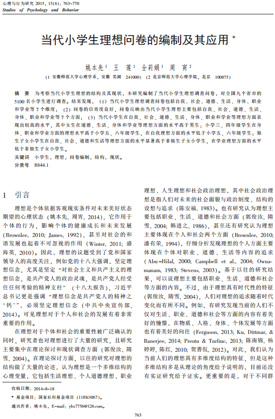 姚本先、王莲、全莉娟、周 宵:当代小学生理想问卷的编制及其应用
