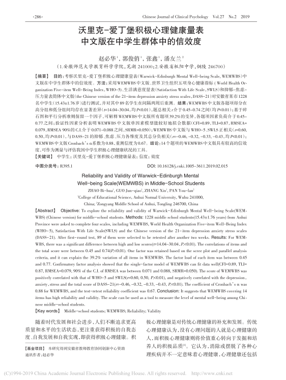 赵必华等:沃里克—爱丁堡积极心理健康量表中文版在中学生群体中的信效度