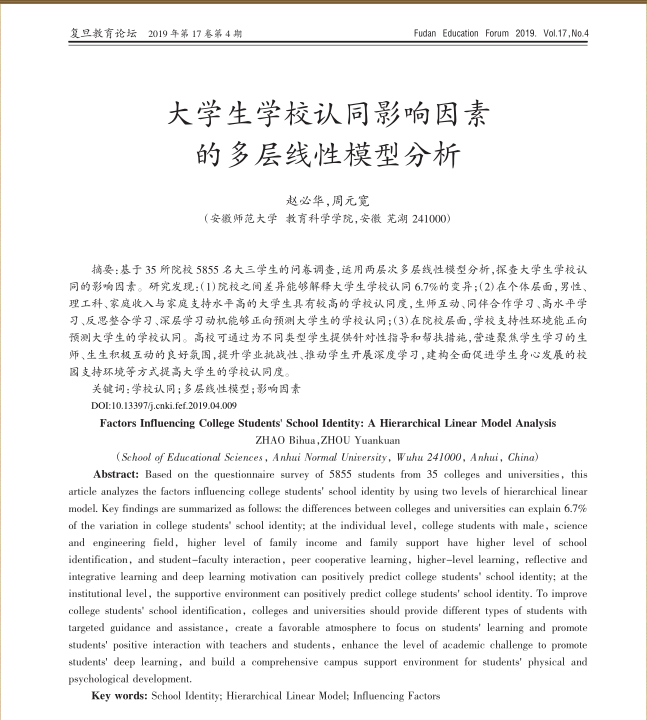 赵必华,周元宽:大学生学校认同影响因素的多层线性模型分析